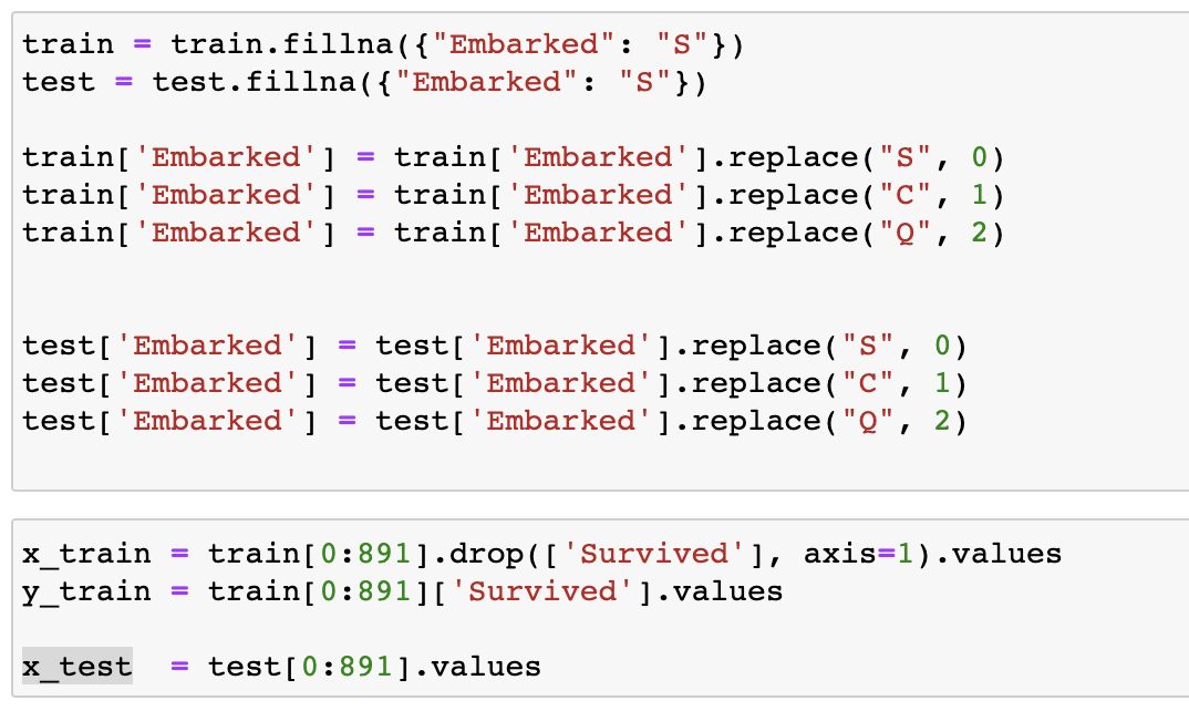 아래처럼 Embarked 값도 정수형으로 변환하고 나면 간단한 모델링 구현을 위한 데이터 전처리 작업은 끝나게된다.