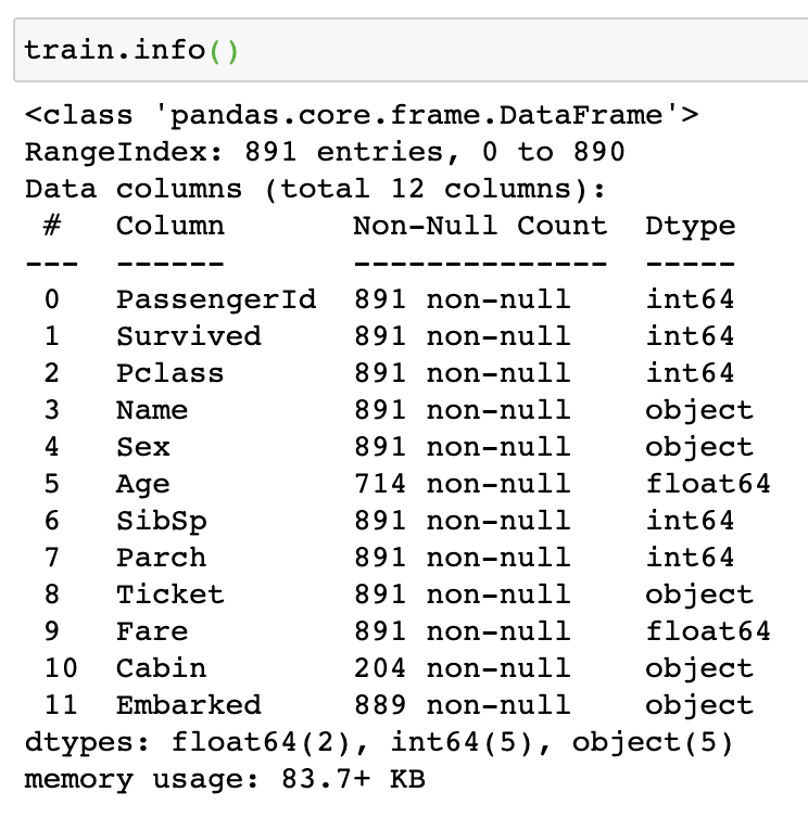 아래 info 를 보면, Cabin 과 Age 데이터에 Null 데이터가 다수 존재하는 것을 알 수 있다. 해당 컬럼들에 대해 적절한 값을 추가해줄지 여부도 고려사항이다. 하지만, Cabin등의 값들은 결과에 대해 큰 영향을 주진 않을듯 하여 아예 drop 하는 것도 염두에 둘 필요가 있다.